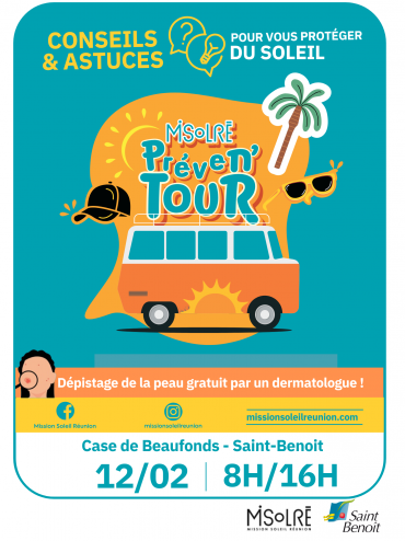 La Mission Soleil Réunion vous donne rendez-vous le jeudi 12 février de 8h à 16h, à la maison de quartier de Beaufonds ! Programme : Dépistage gratuit de la peau par un dermatologue | Activités ludiques autour des dangers du soleil | Conseils, éch...