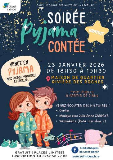 Soirée Pyjama Contée Dans le cadre des Nuits de la Lecture, les médiatrices culturelles invitent petits et grands à une soirée magique en pyjama ! Vendredi 23 janvier 2026 de 18h30 à 19h30 à la maison de quartier Rivière des Roches Venez en...