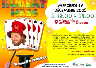 Koutchapo ! - Spectacle interactif avec Hubert Hess Mercredi 17 décembre 2025 de 16h00 à 17h00, à la médiathèque Antoine L. ROUSSIN Après une pause bien méritée, Hubert Hess revient avec un spectacle participatif où petits et grands seront au c...