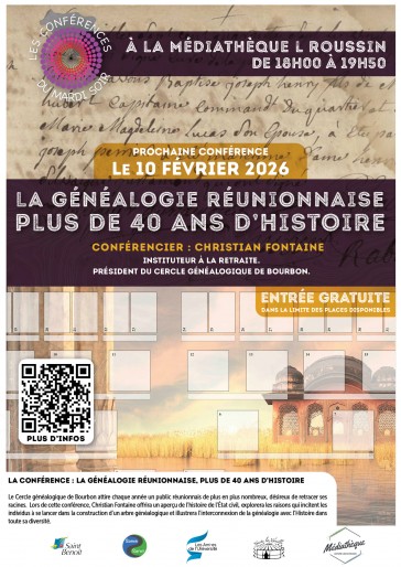 Conférence – La généalogie réunionnaise : plus de 40 ans d’histoire Mardi 10 février 2026 de 18h00 à 19h50 à la Médiathèque Antoine Louis ROUSSIN Jusqu’où peut-on remonter dans ses racines ? C’est à cette question et à bien d’autres défis pa...