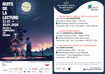 NUITS DE LA LECTURE 2026 – 10ᵉ ÉDITION Trois rendez-vous, trois ambiances, une même passion : le plaisir de lire et d’imaginer. - ATELIER DESSIN – Manga, BD & Illustration Plonge dans l’univers du dessin et apprends à créer tes propres personna...