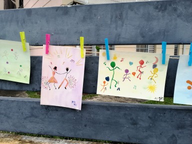 Cette exposition éphémère repose sur un principe simple : suspendre des réalisations artistiques sur un fil à l’aide de pinces à linge. Le thème de cette édition : Le Jeu du Je-Nous. Les jeunes de la MJC-Centre Social de Saint-Benoît ont exposé leurs œuvres sur les grilles de l’école Les Girofles, tandis que les élèves du collège Bassin Bleu ont investi le jardin près de la mairie annexe à Sainte-Anne.