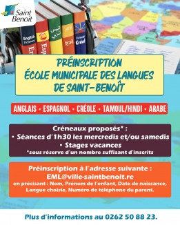 Les cours sont proposés en anglais, espagnol, créole, tamoul/hindi et arabe, sous forme de séances d’1h30 les mercredis et/ou samedis, ainsi que lors de stages pendant les vacances scolaires, sous réserve d'un nombre suffisant d'inscrits.