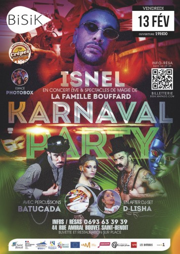 Le vendredi 13 février, le Bisik prend en effet de l’avance sur Mardi Gras et lance le carnaval plus tôt que prévu : la Karnaval Party explosive, avec le concert d’Isnel et ses musiciens ! Entre deux tempos… les spectacles de magie extravagants de L...