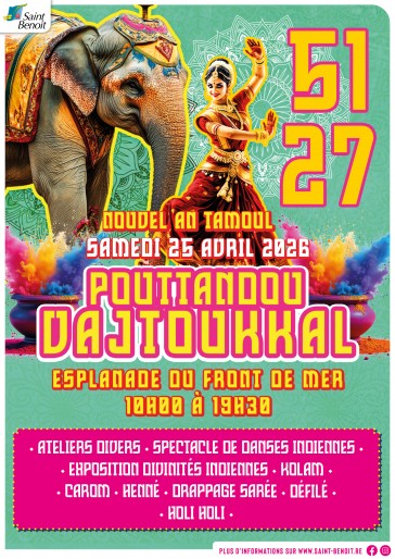 La Ville de Saint-Benoît vous donne rendez-vous le samedi 25 avril, de 10h00 à 19h30 sur l'esplanade du front de mer, pour célébrer le Nouvel an tamoul 5127 dans une ambiance festive, colorée et empreinte de traditions. Découvrez dès maintenant le programme complet !